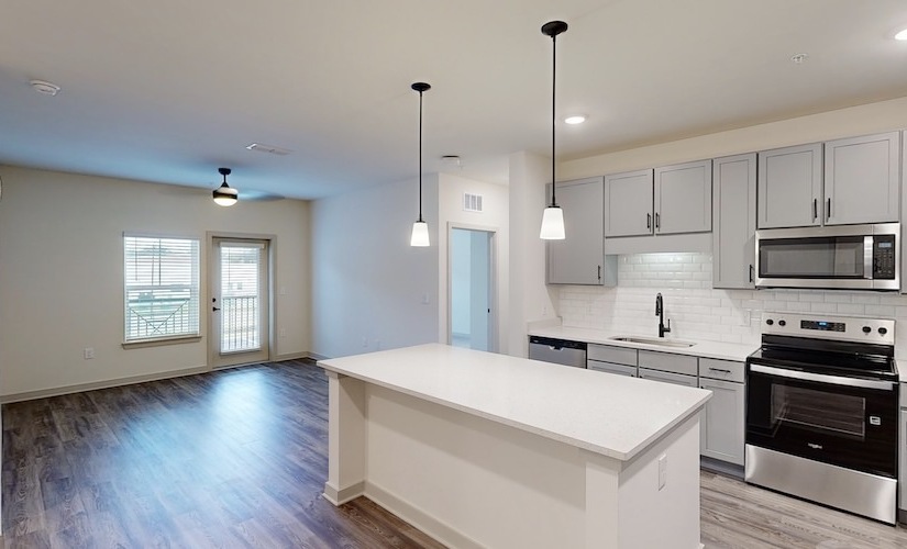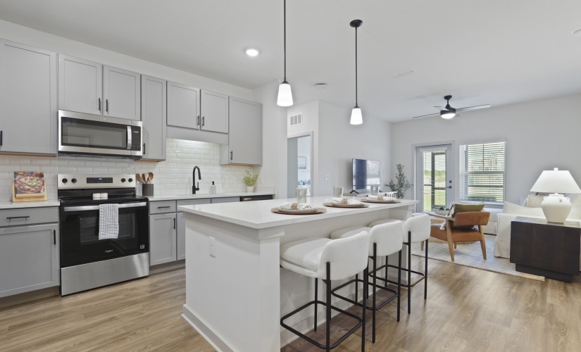 a kitchen with a large island and chairs Find your perfect fit at HoM at Pooler Right in the heart of Pooler Cutting-edge amenities at your fingertips State-of-the-Art Fitness Center Every Patio Screened In